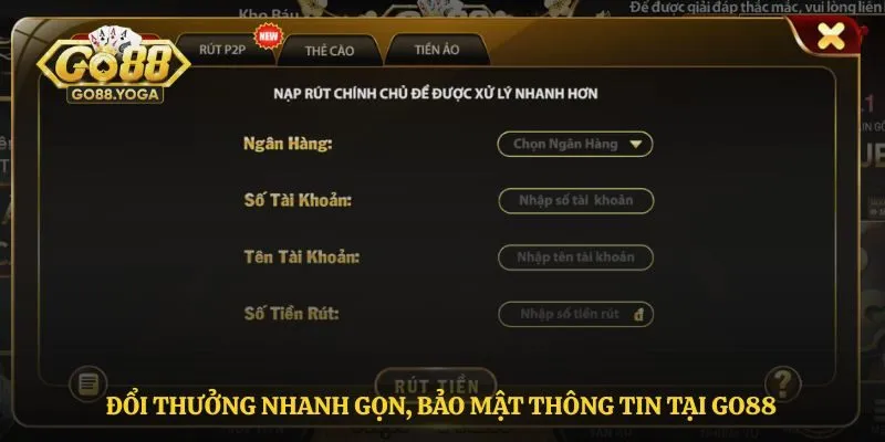 Khi đã sở hữu một khoản lợi nhuận từ các trò chơi hấp dẫn, bạn chắc chắn sẽ muốn quy đổi chúng thành tiền mặt. Quy trình rút tiền tại Go88 được đánh giá là minh bạch và có tốc độ xử lý hàng đầu hiện nay.